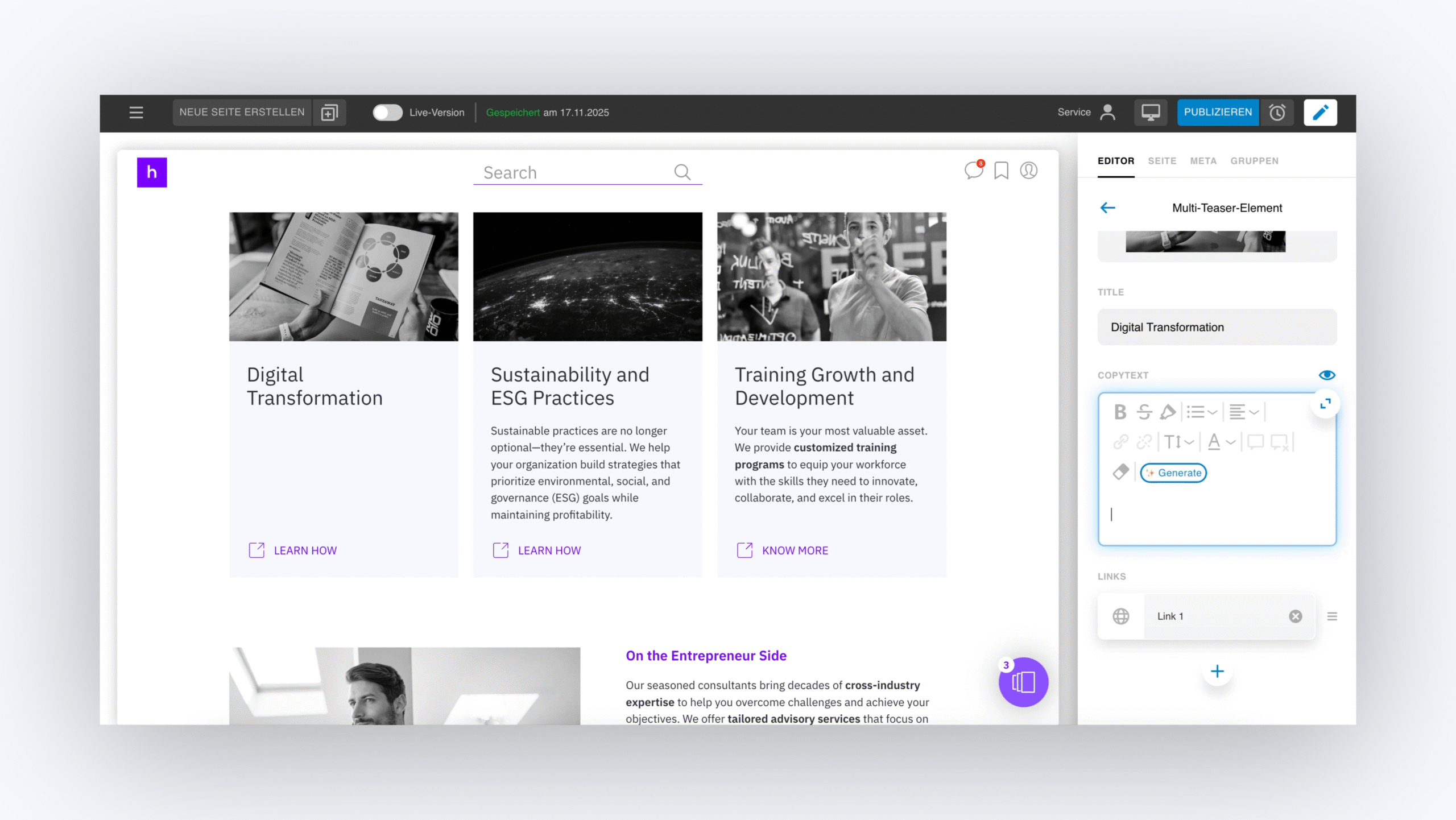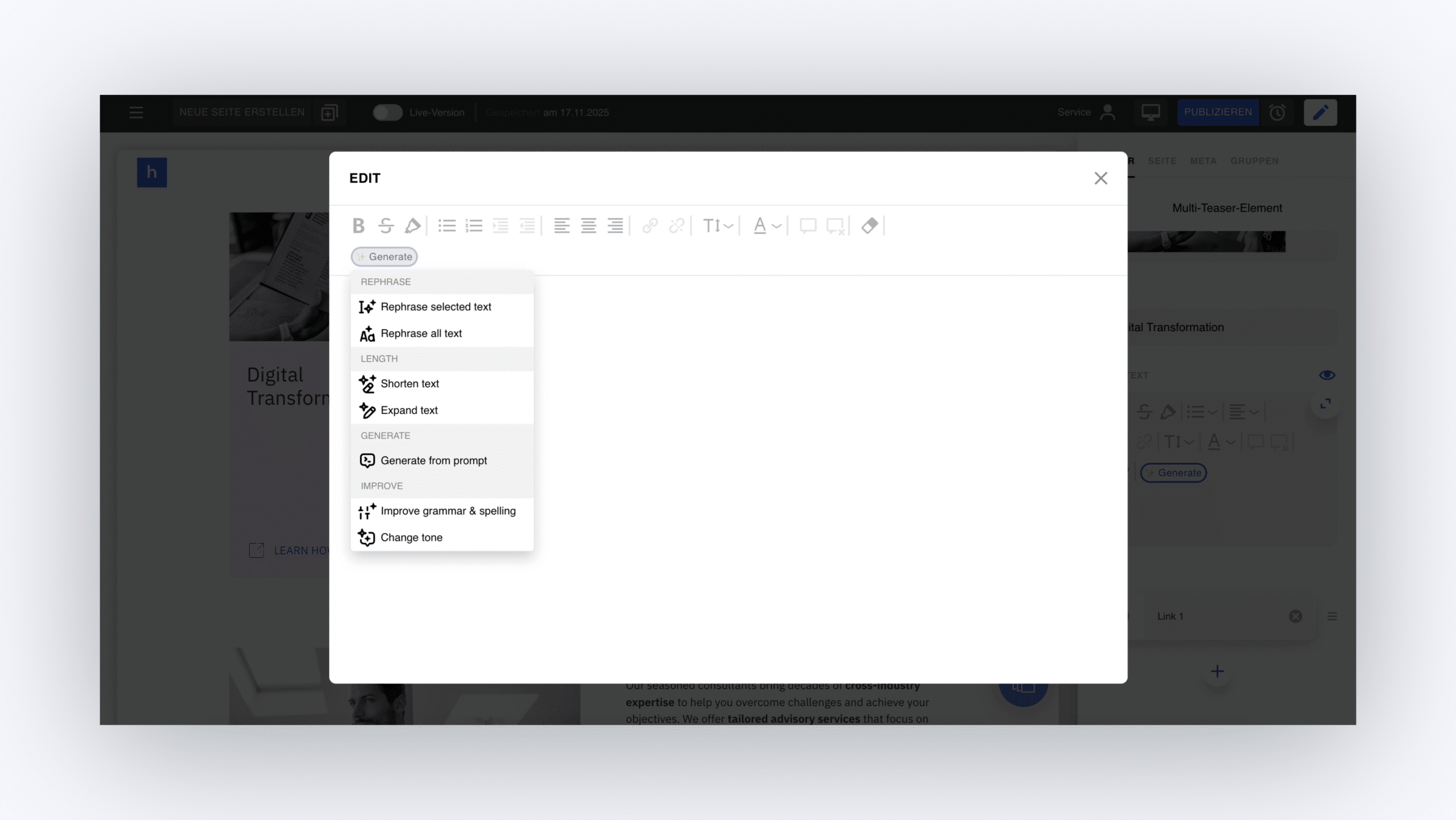 Stell dir vor, du sagst der KI, was du brauchst - jederzeit und überall zu erstellen - und zu sehen, wie sie sofort geliefert werden. Mit der KI-Integration der nächsten Generation von headful wird die Erstellung von Inhalten mühelos und wirklich mobil. Leite eine E-Mail mit wichtigen Details weiter, teile ein paar Schlüsselwörter oder Dokumente, und headful verwandelt sie in zielgerichtete Inhalte oder vollständig gestaltete Seiten für deine Projekte.